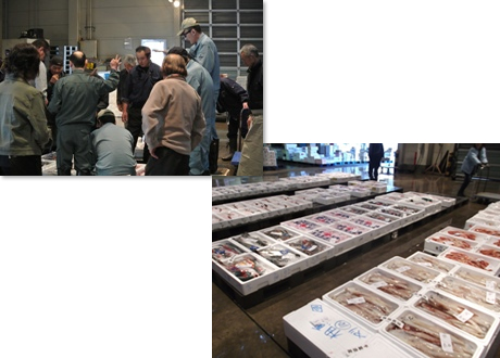 鐘の音を合図に鮮魚の「競」がはじまる。